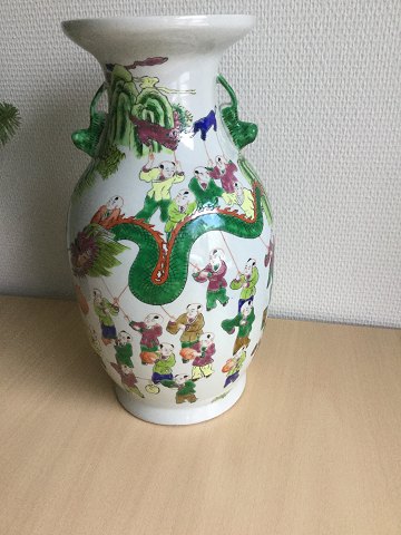 Gammel kinesisk vase. Dekoreret med drage og scenerier med både og personer. 2 ører i form af Fu-hunde. Kina. Højde 31 cm. Diameter i top - 14 cm. Diameter i bund - 12 cm.