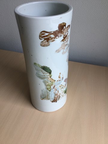 Antik Hatstand vase. Kina 19 årh. Polykromt dekoreret med personer samt skriftstegn. Stemplet i bund. Højde - 29 cm. Diameter - 12½ cm.