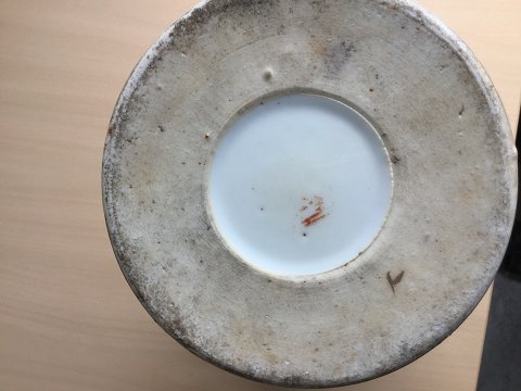 Antik Hatstand vase. Kina 19 årh. Polykromt dekoreret med personer samt skriftstegn. Stemplet i bund. Højde - 29 cm. Diameter - 12½ cm.