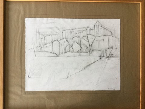 Ann-Dorte Nielsen (født 1952): Sydlandsk Byparti 1986. Kul på papir. Sign.: ADN/86 Indrammet med passepartout. Signeret på passepartout: Ann-Dorte Nielsen. 39x52 (63x77) 24224