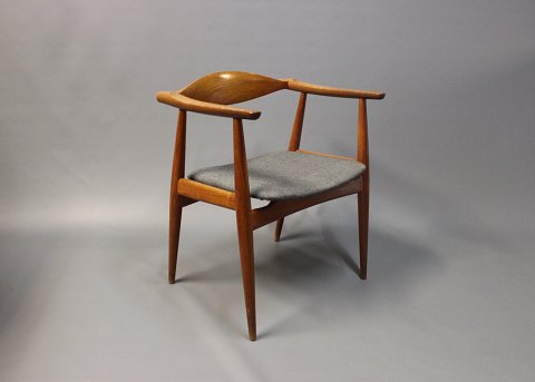 Solgt2 CH-35 stole designet af Hans J. Wegner i 1959 og fremstillet hos Carl Hansen & Søn. Stolene er i teak og betrukket med gråt uld.