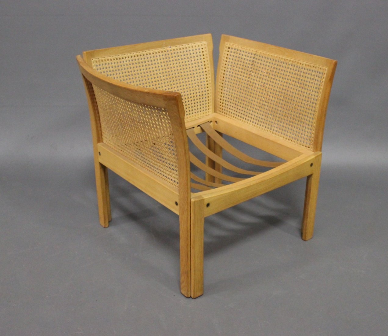 SoldA pair of easy chairs in oak designed by Rud Thygesen and Johnny Sørensen, manufactured by Silkeborg furniture factory in the 1960s.