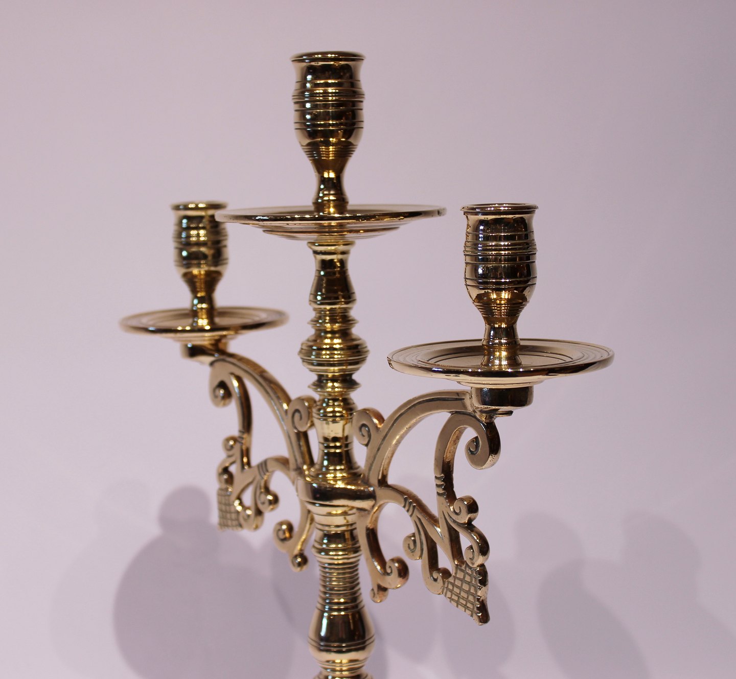 SoldA pair of large three armed brass candlesticks, in great vintage condition from around the 1890s.