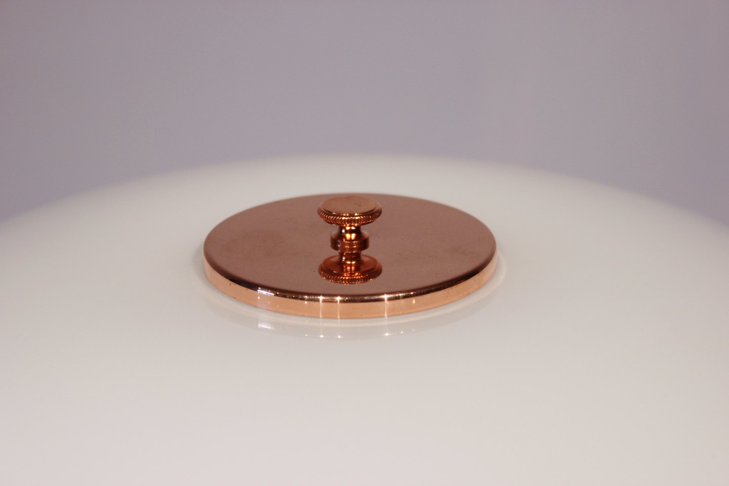 PH3½-2½, limited edition, copper floor lamp designed by Poul Henningsen and manufactured by Louis Poulsen. The lamp is with the larger shade of opaline glass.