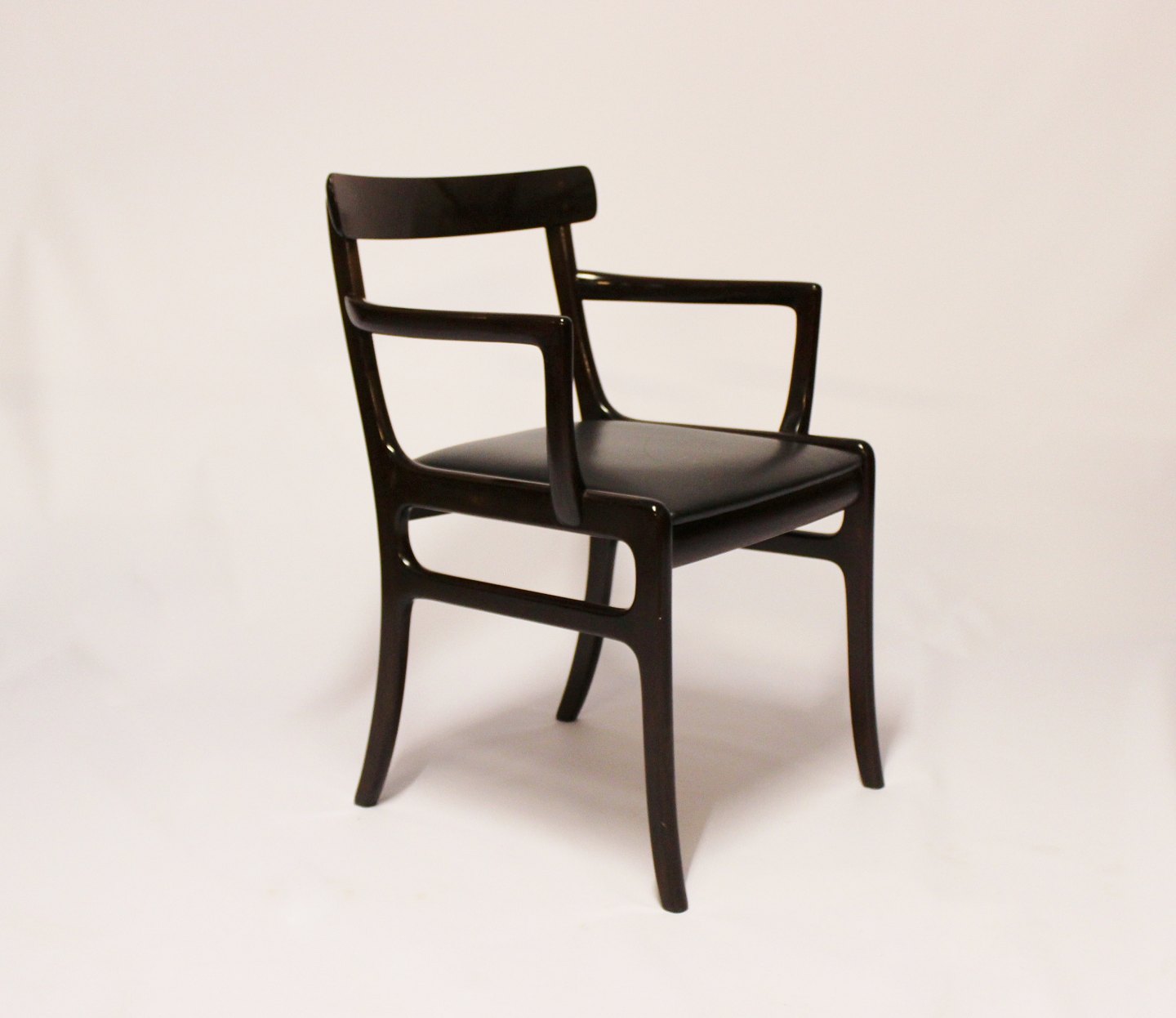 SoldA pair of "Rungstedlund" armchairs in mahogany and uppolstered in black leather, designed by Ole Wanscher and manufactured by P. Jeppesen.