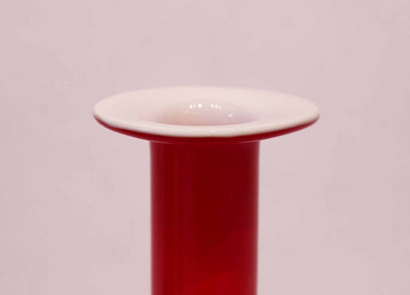 SolgtStor rød glas vase med indvendig hvidt opal glas af Otto Brauer for Holmegaard.