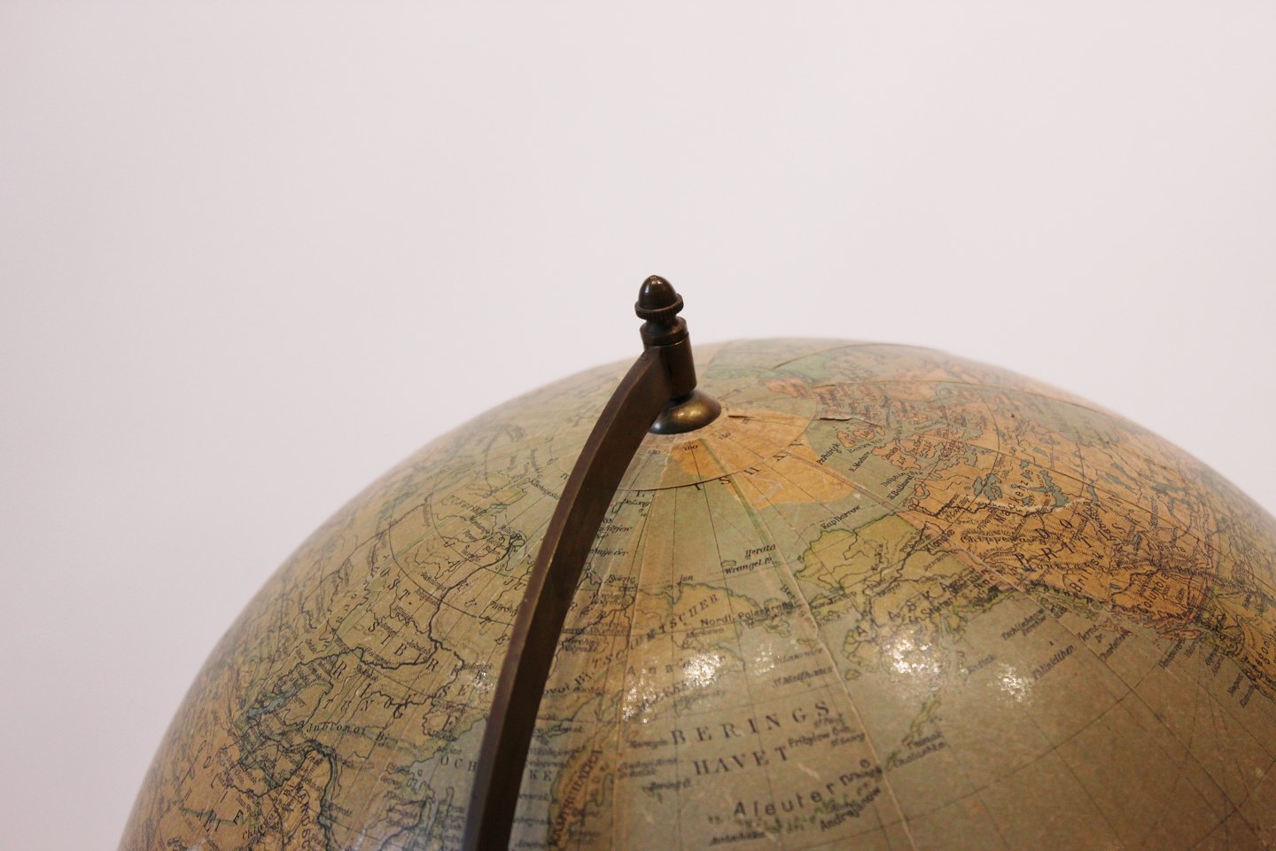 Antique globe with frame of polished wood and brass from the 1940s. The globe is in great vintage condition.