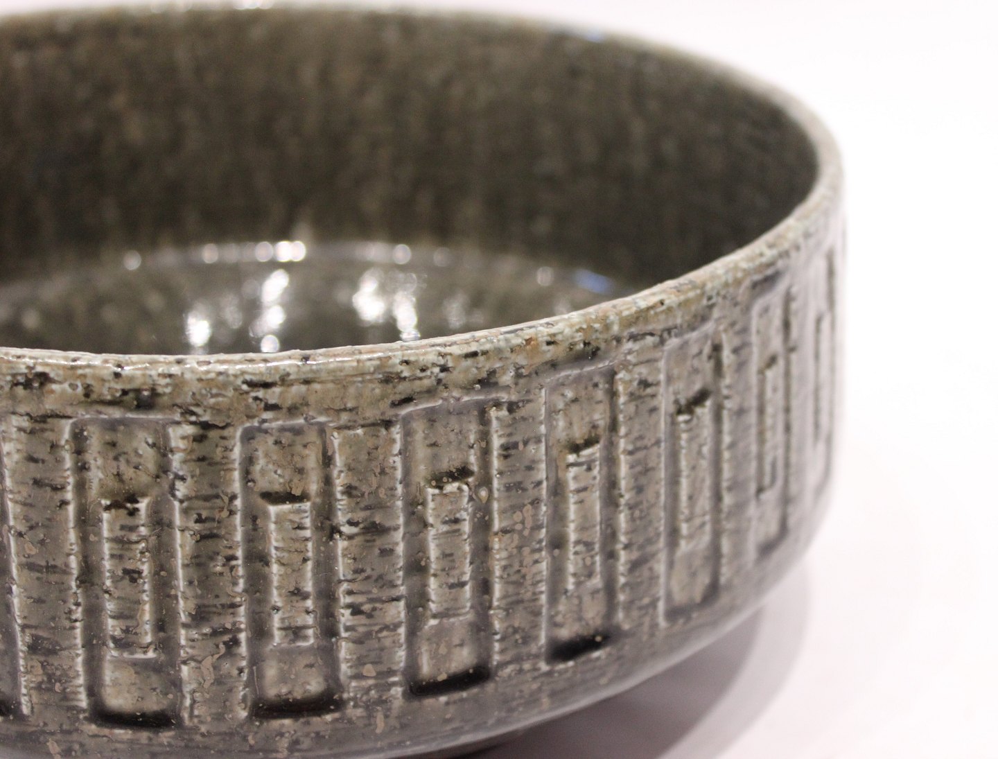 SoldLarge ceramic bowl with glaze in green colors by Palshus. The bowl is in great vintage condition.