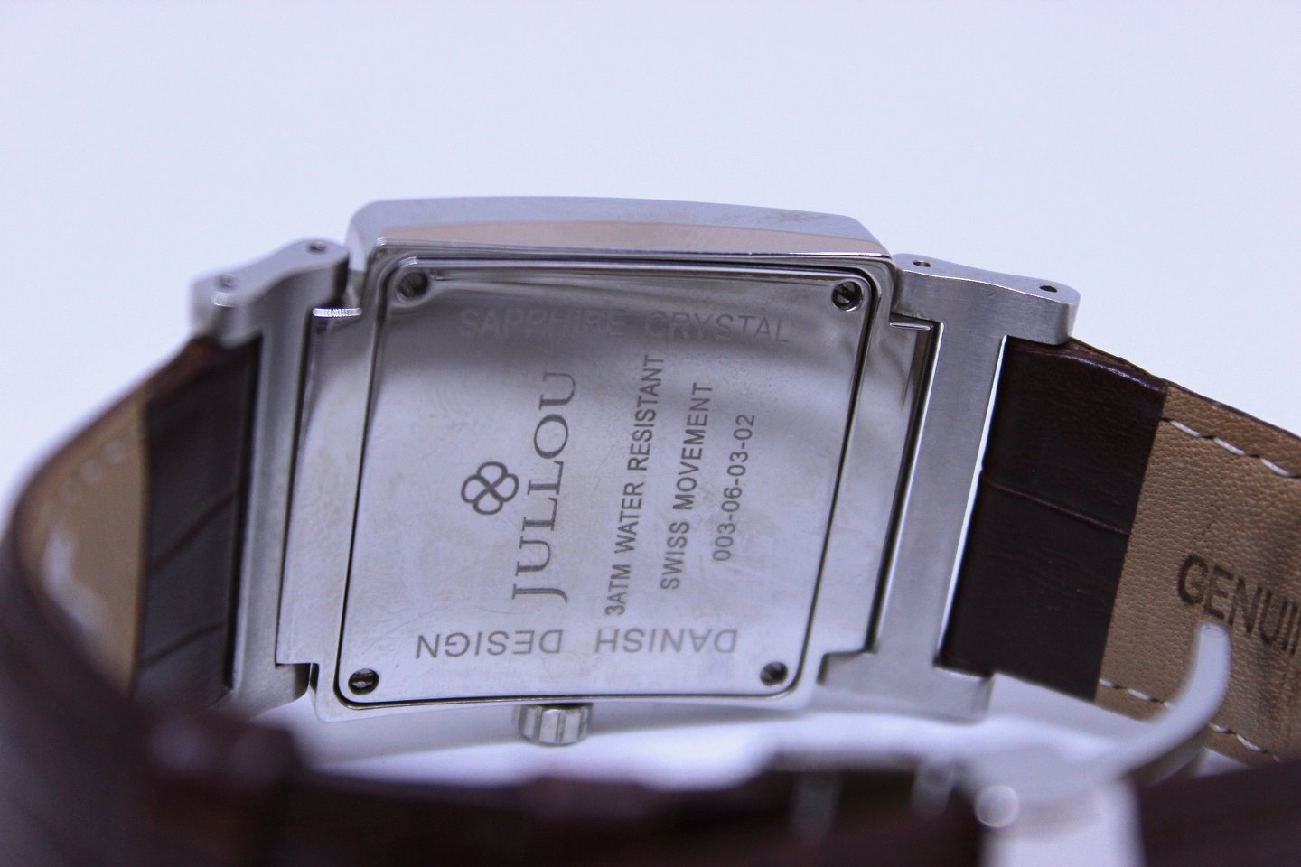 SolgtJullou herre armbåndsur med swiss quartz urværk, urkasse af stål med 20 indbefattede diamanter og brun læderrem. Uret er i flot brugt stand.