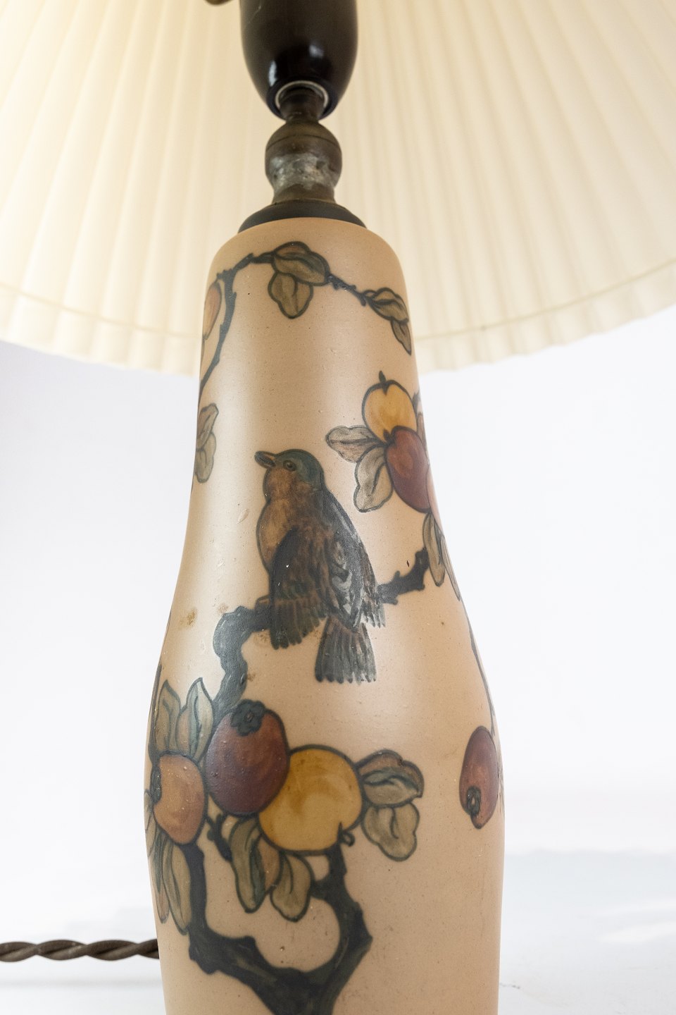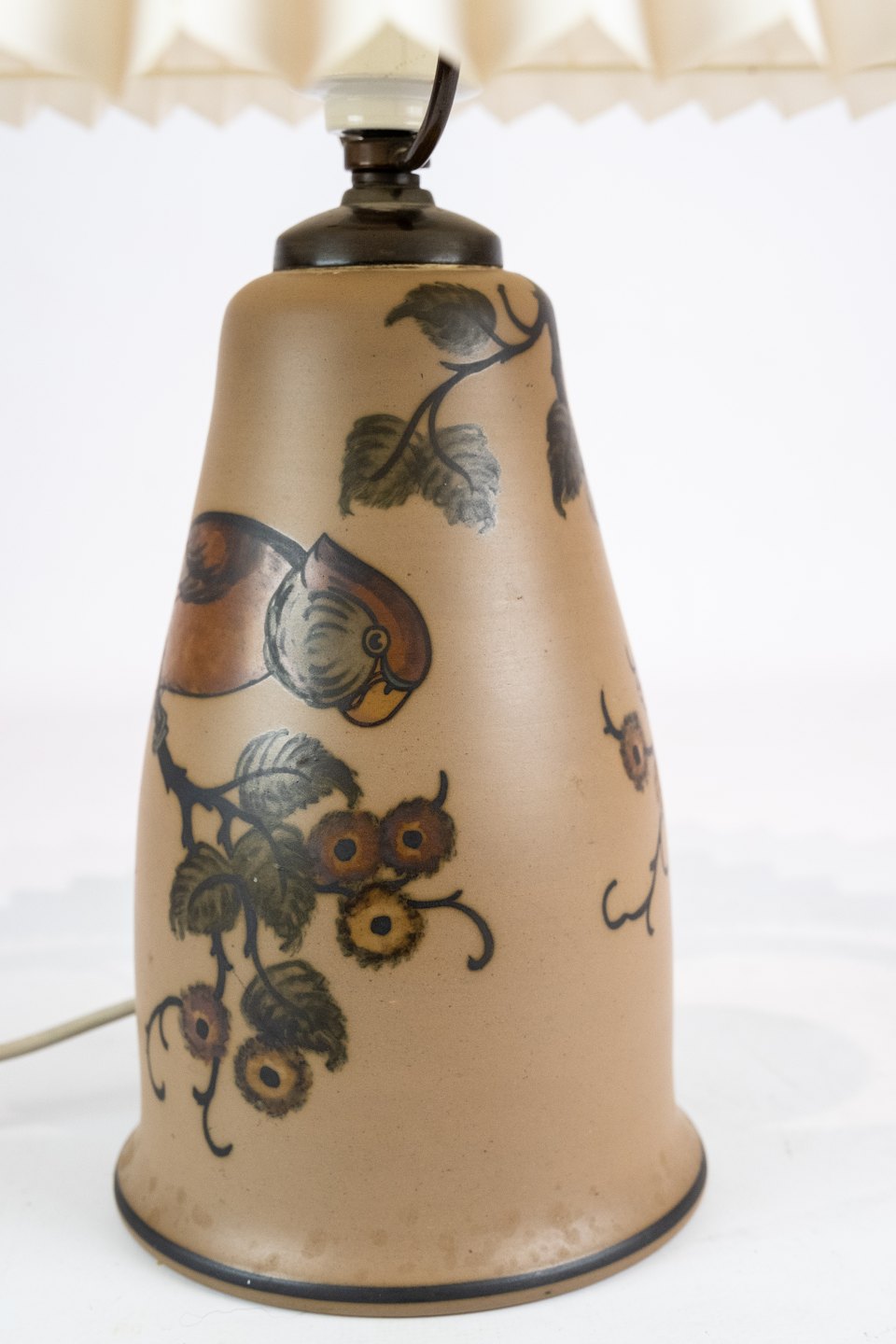 Bordlampe i brune farver, nr.: 5, af Hjorth Danmark fra 1960erne. Skærmen er håndfoldet og håndmalet i papir.