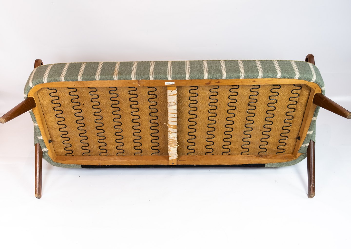 SolgtTo personers sofa polstret med lysegrønt stribet stof med teak ben og arme af dansk design fra 1960erne. Sofaen er i flot brugt stand.