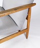 SolgtLænestol, model J65 af lyst træ og polstret med gråt uldstof designet af Ejvind A Johansson for FDB.