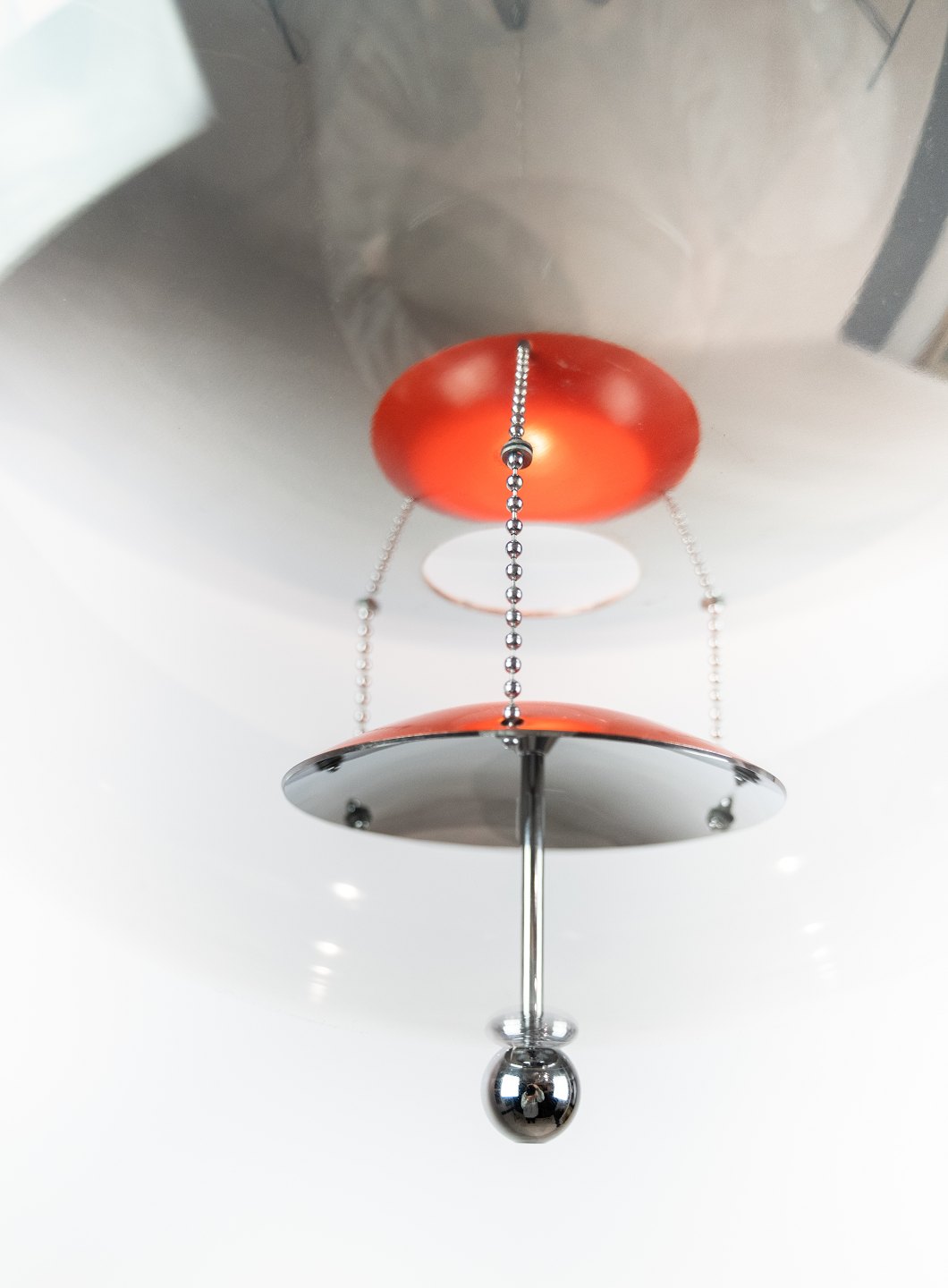 Globe, 40, designed by Verner Panton in 1969. The lamp is a transparent acrylic globe with 5 hanging metal reflectors, which is lacquered in White, blue and red.