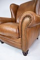 Stor hvilestole/øreklapstol i cognacfarvet læder. Stolen er i flot brugt stand.