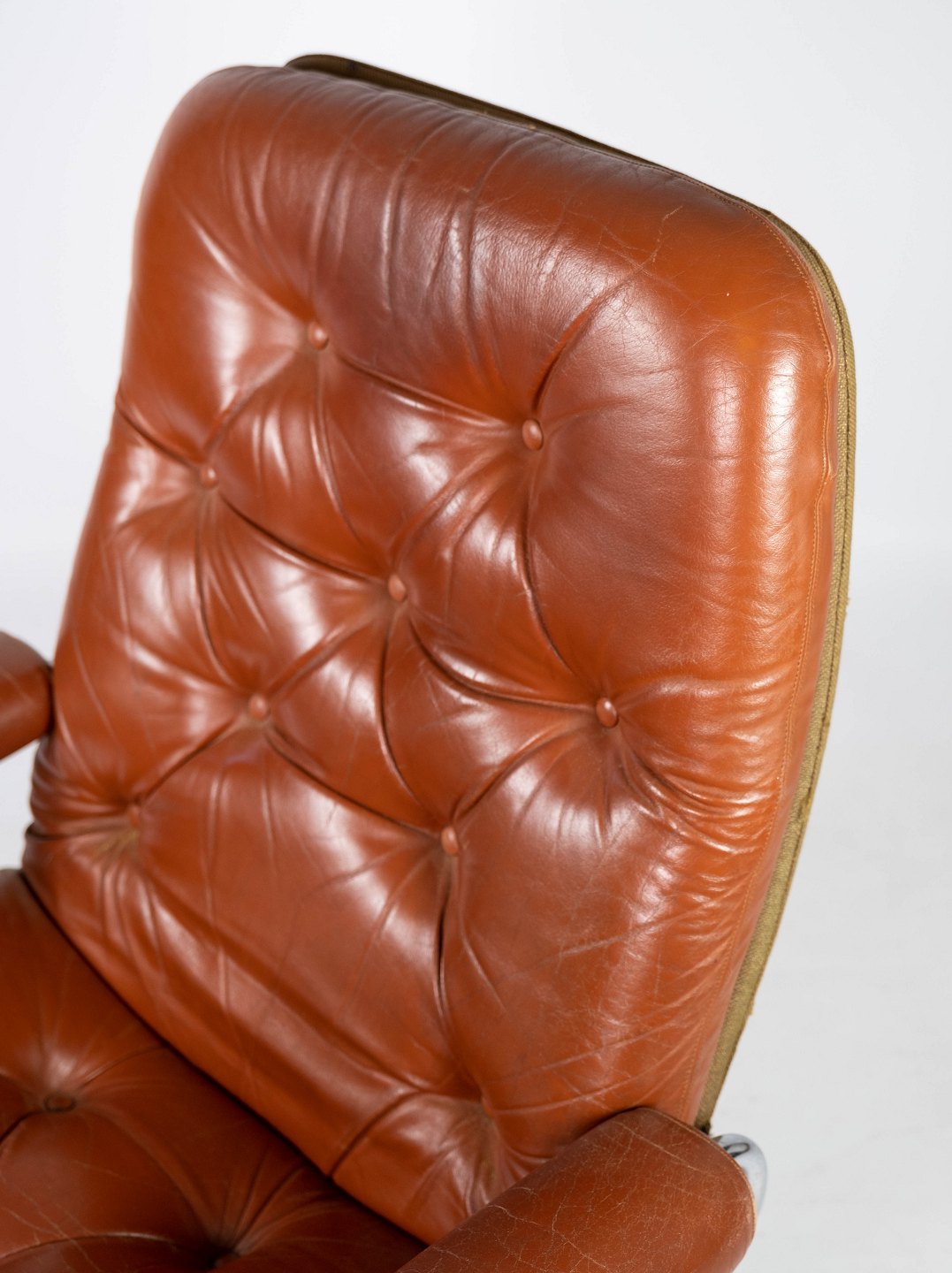 Easy chair upholstered with brown patinated leather of norwegian design from the 1970s.