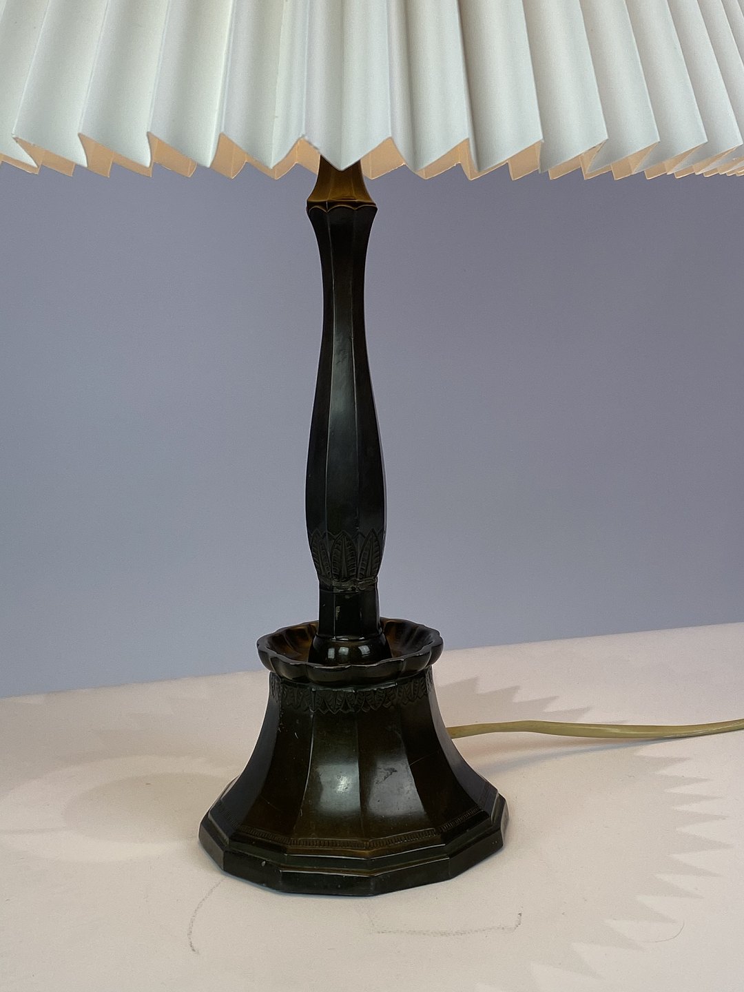 SoldTable lamp in disco-metal by Just Andersen with paper shade, from the 1930s. The lamp is in great vintage condition.