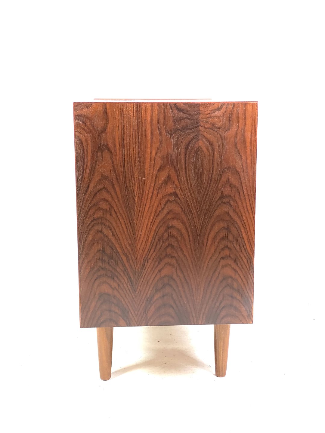SolgtFå et stykke møbelhistorie med denne elegante kommode i palisander fra 1960'erne. Palisandertræet giver kommoden en varm og naturlig glød, samtidig med at det fremhæver den fine håndværksmæssige udførelse, der var typisk for møbeldesign på det tidspunkt.