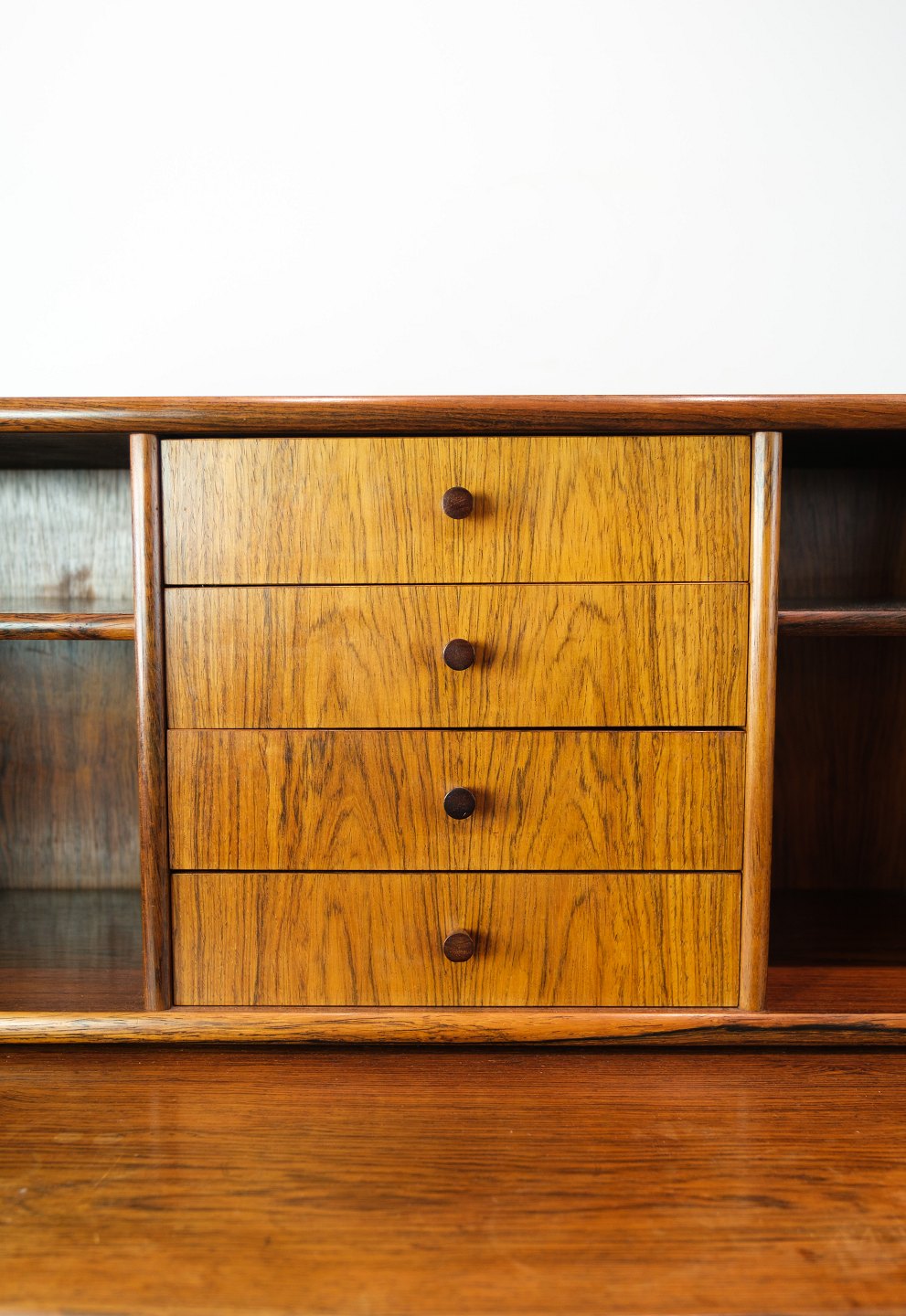 Small chatol in rosewood of Danish design from around the 1960s. Looks incredibly nice in the stand with 3 drawers at the bottom and 4 drawers at the top with shelves on each side. In addition to this, the chartolette has a pull-out.