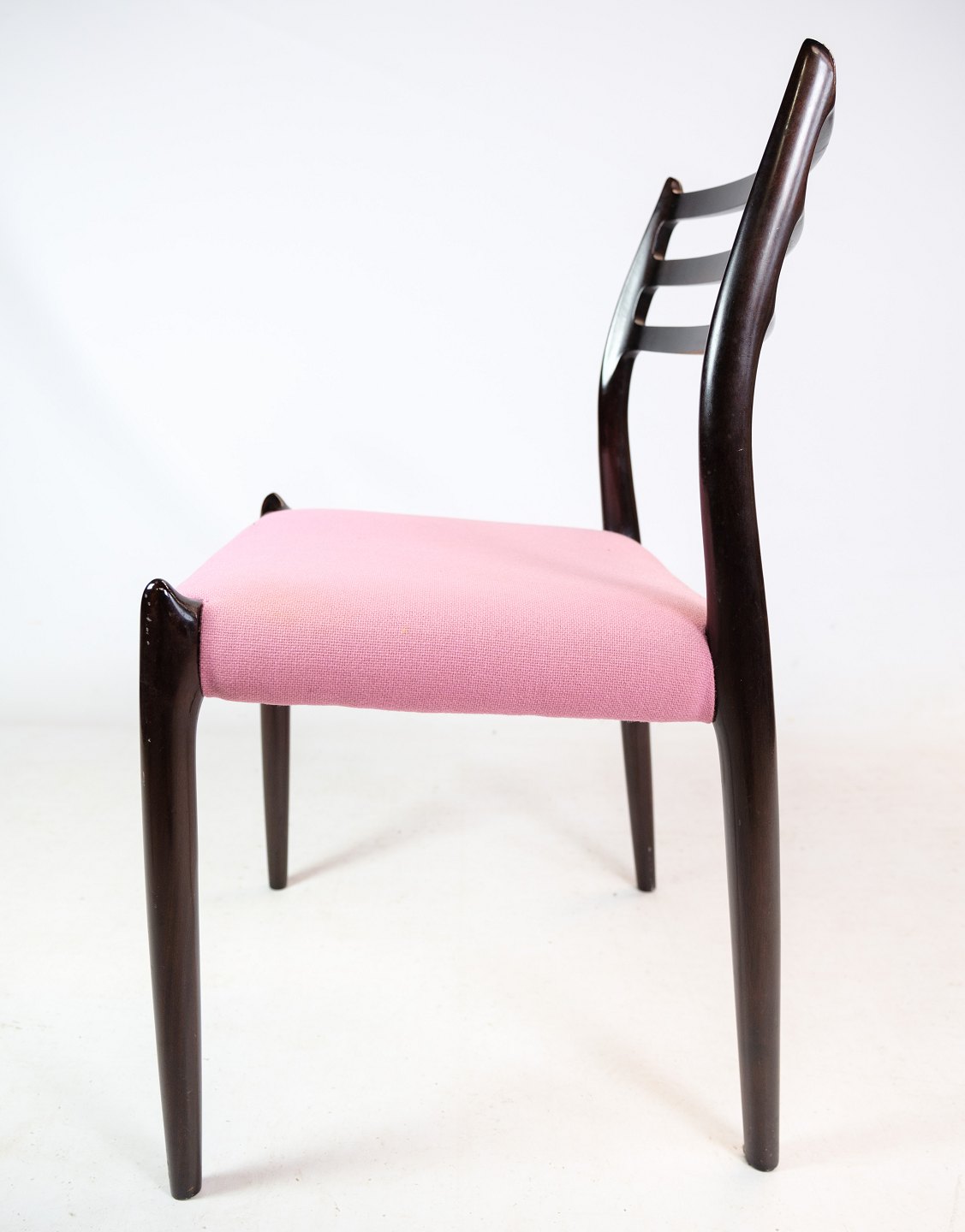 The dining table chairs model 78, designed by the Danish furniture designer N.O. Møller and manufactured by JL Møller, is an example of timeless Danish craftsmanship and design. The chairs are made of mahogany, which is a type of wood known for its durability and beauty.