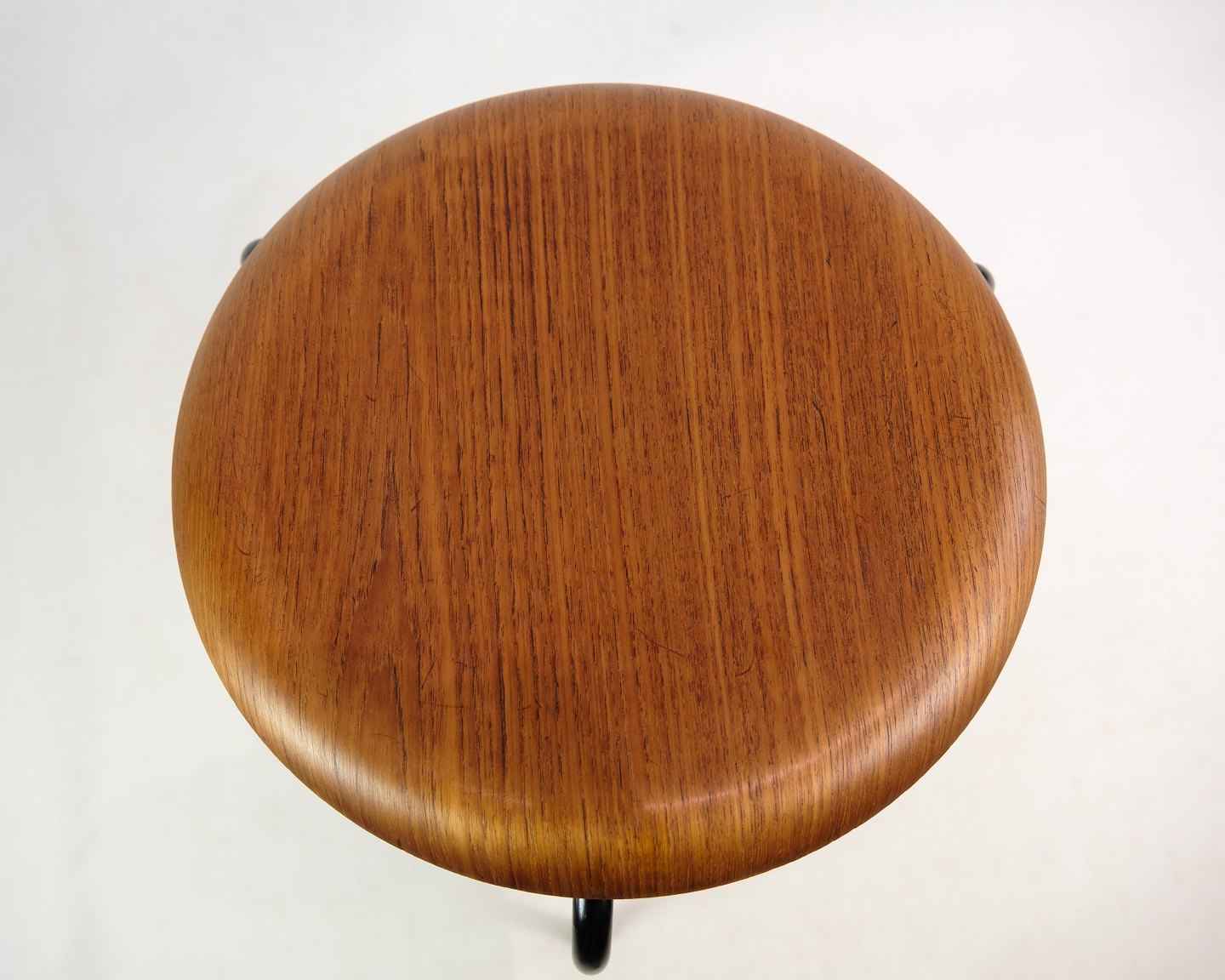 SolgtEt sæt skamler af træsorten teaktræ med sort stel, designet af Arne Jacobsen og fremstillet af Fritz Hansen fra omkring 1950'erne.