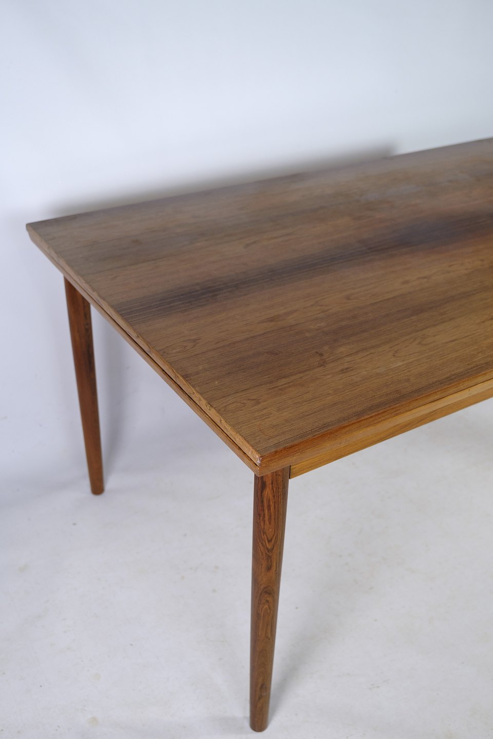 Spisebord af dansk møbelsnedker i palisander med hollandsk udtræk fra omkring 1960'erne. Toppladen kan slibes ned og laves samme farve som tillægsplader inkluderet i prisen.