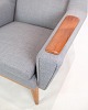 Lænestol af dansk design med stel af egetræ og arme af teaktræ ny polstret i gråt hallingdal stof fremstillet i 1960'erne.