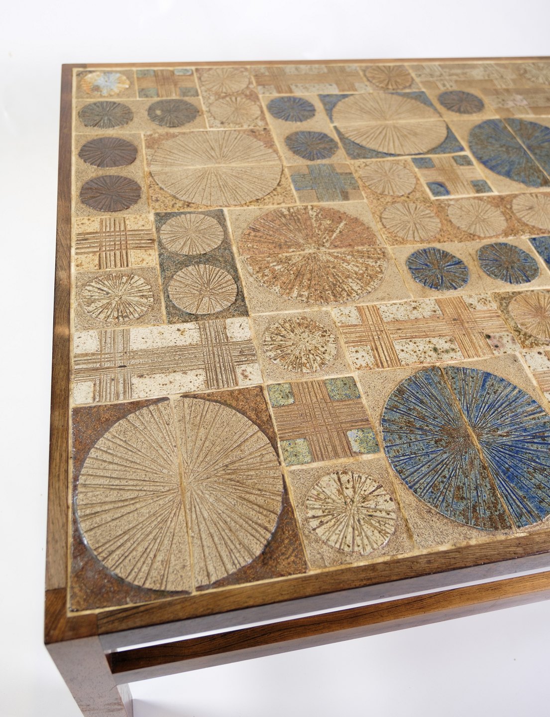 Palisandertømmeret tilføjer varme og naturlig skønhed til bordet, mens keramikken og klinkerne giver det et særligt kunstnerisk præg. Den kontrastfulde kombination af disse materialer skaber et iøjnefaldende visuelt udtryk, der kan tilføre karakter og personlighed til enhver stue.
