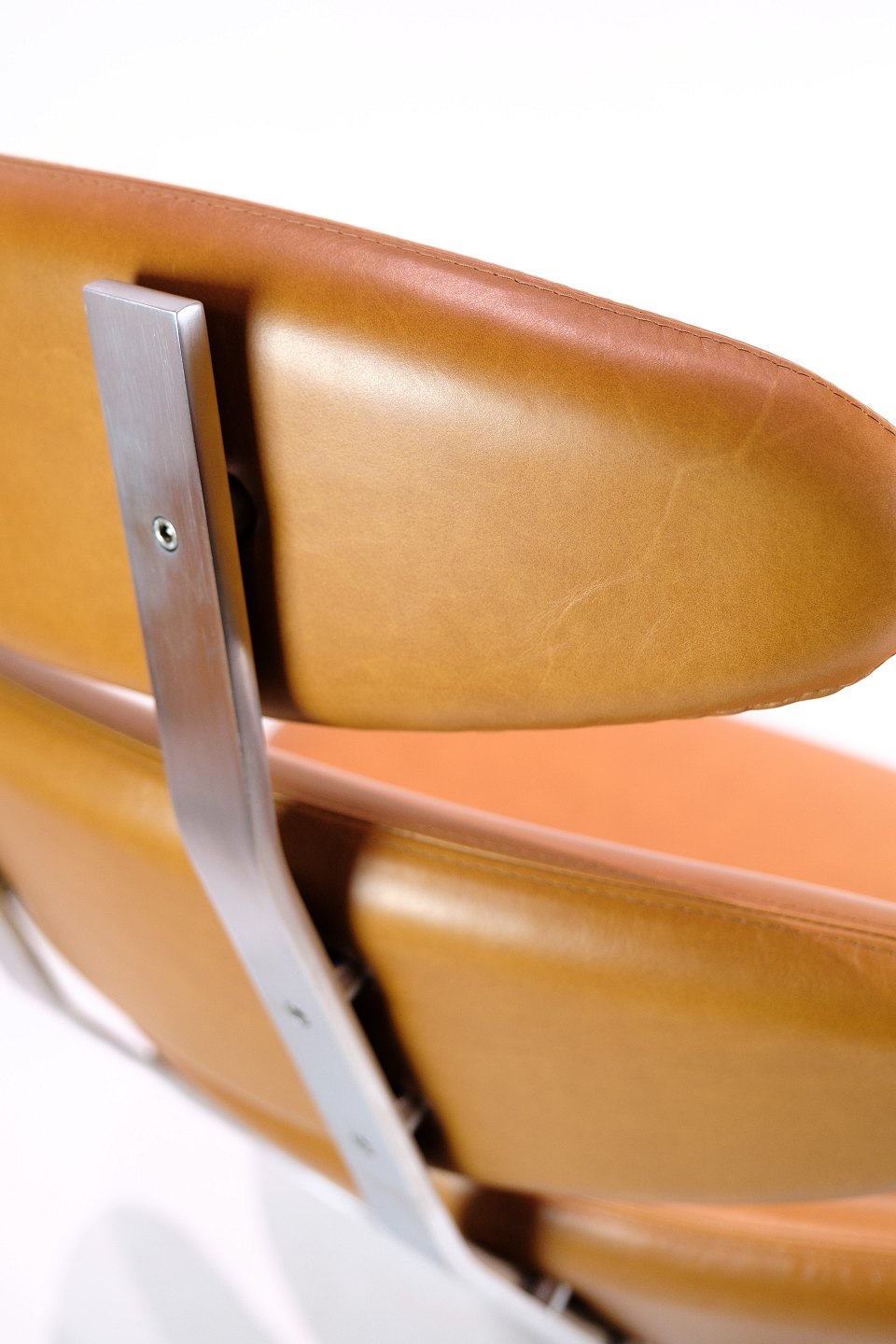 Please contact us for price informationThe Corona recliner, model EJ 5, upholstered in Walnut Elegance leather, designed by Poul M. Volther for Erik Jørgensen in the 1960s. The chair is known for its unique shape and comfort. Poul M. Volther was a pioneer in Danish furniture design, and Erik Jørgensen is known for his focus on quality and craftsmanship.