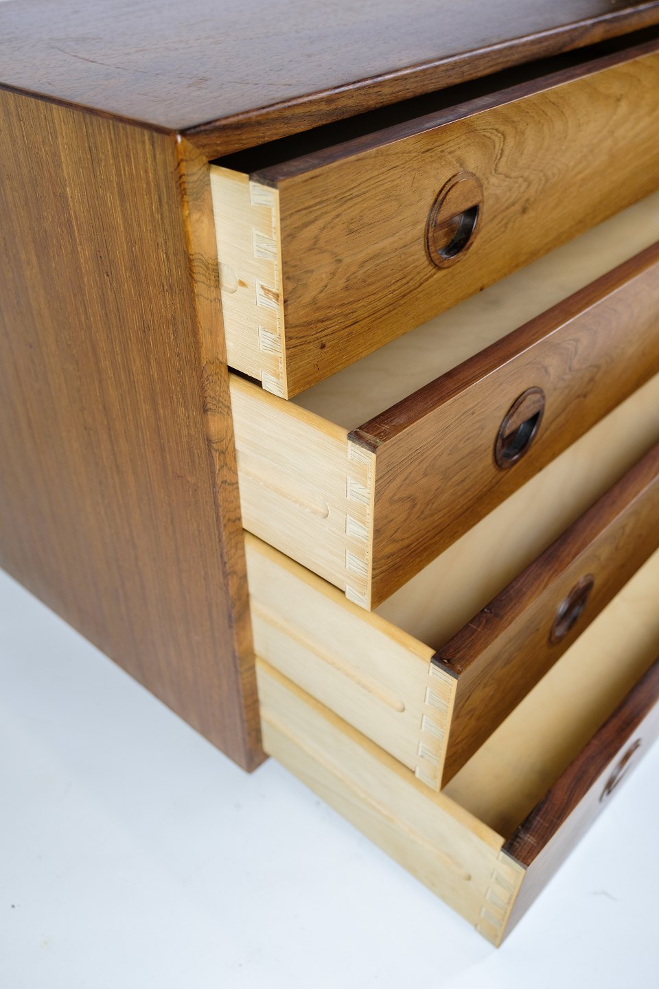 SolgtVæghængt kommode i palisander fra 1960'erne, af dansk design. Kommoden har fire rummelige skuffer og er udstyret med flotte greb, der giver den et ekstra strejf af elegance og godt håndværk.