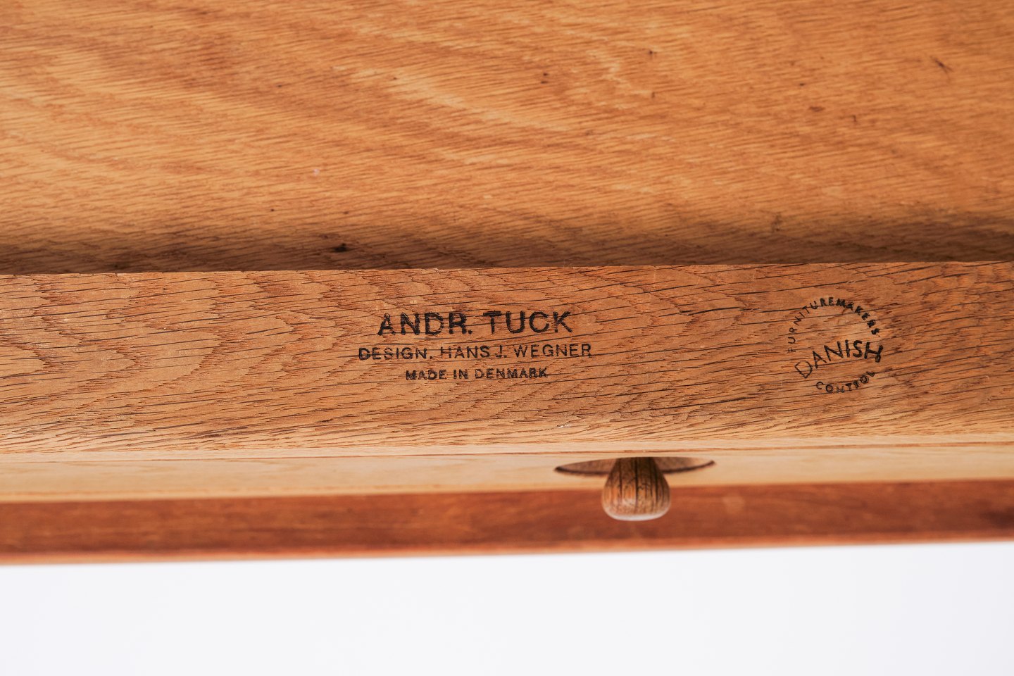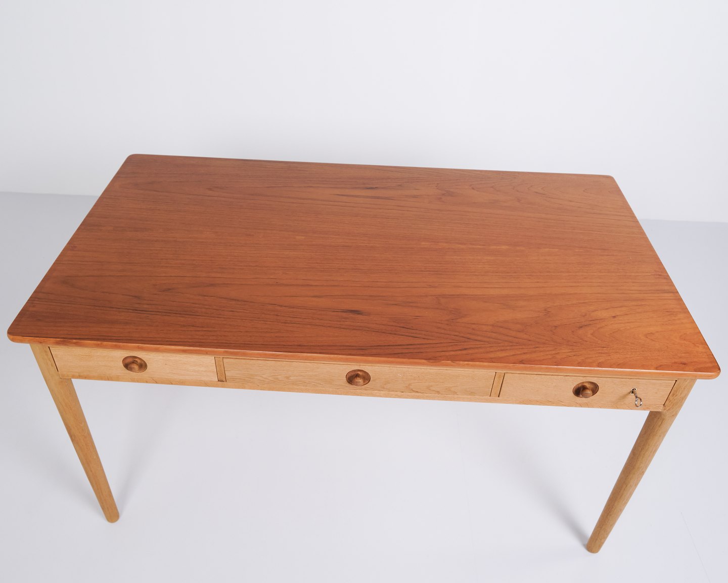 Kontakt os vedrørende prisSkrivebord designet af Hans J. Wegner og produceret af Andreas Tuck i 1960’erne. Bordet er udført i teak med benkonstruktion i eg – en klassisk materialekombination, der fremhæver Wegners sans for proportioner og naturlig balance. Bordet har skuffer i fronten.