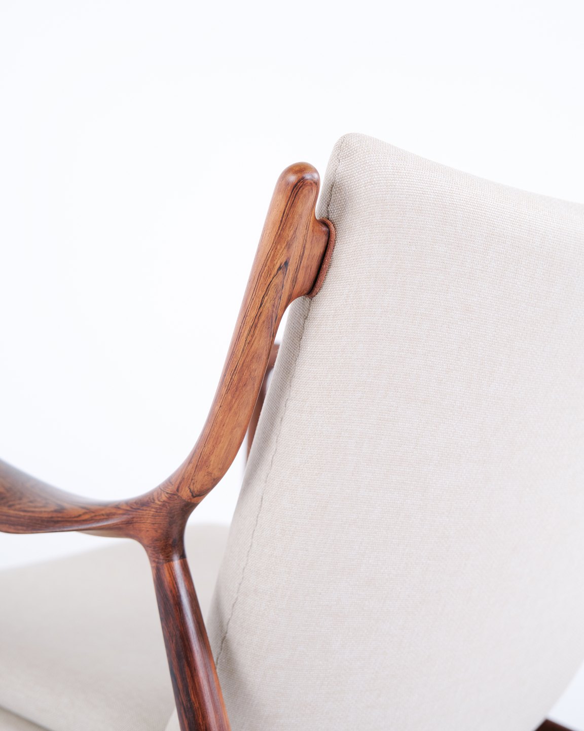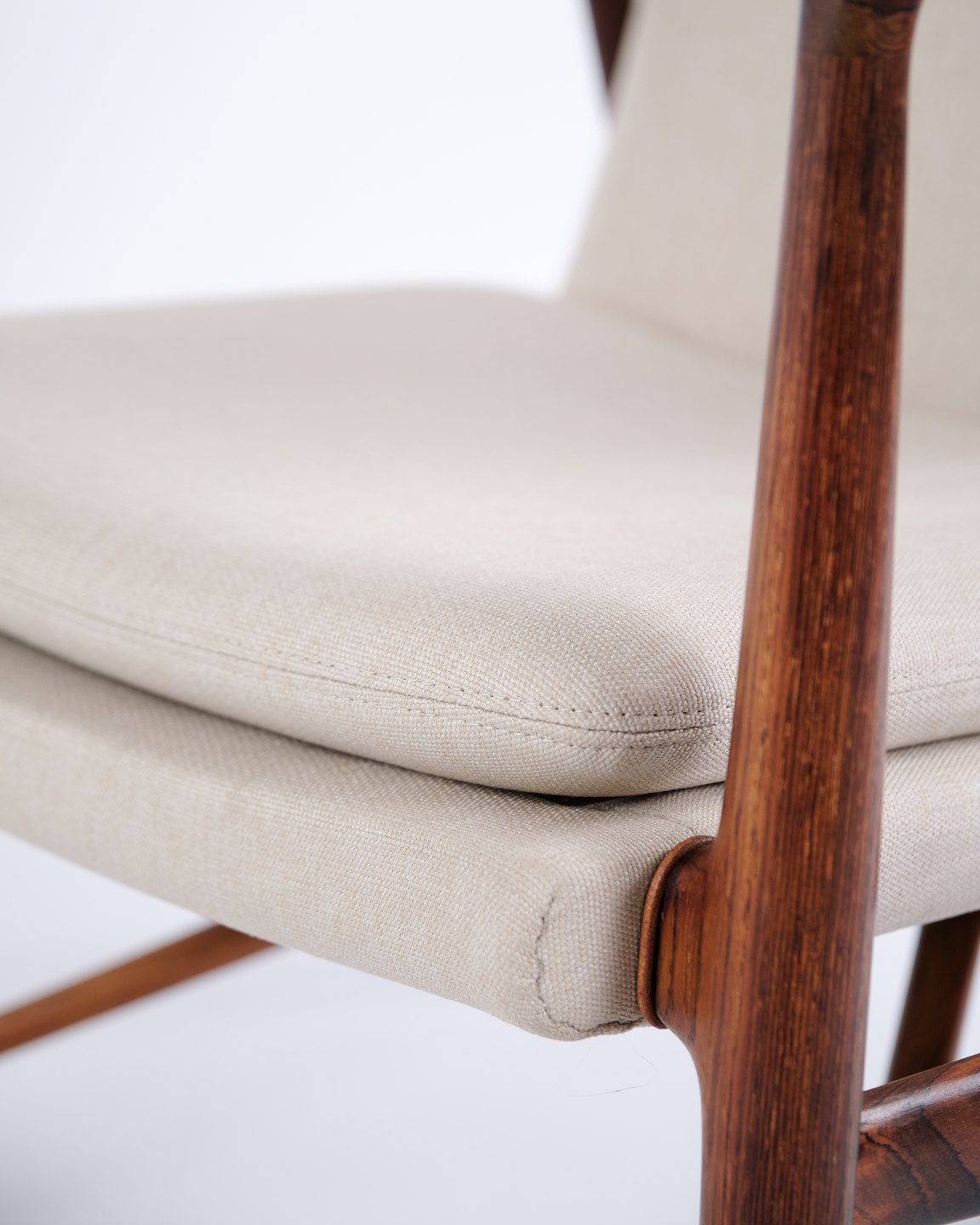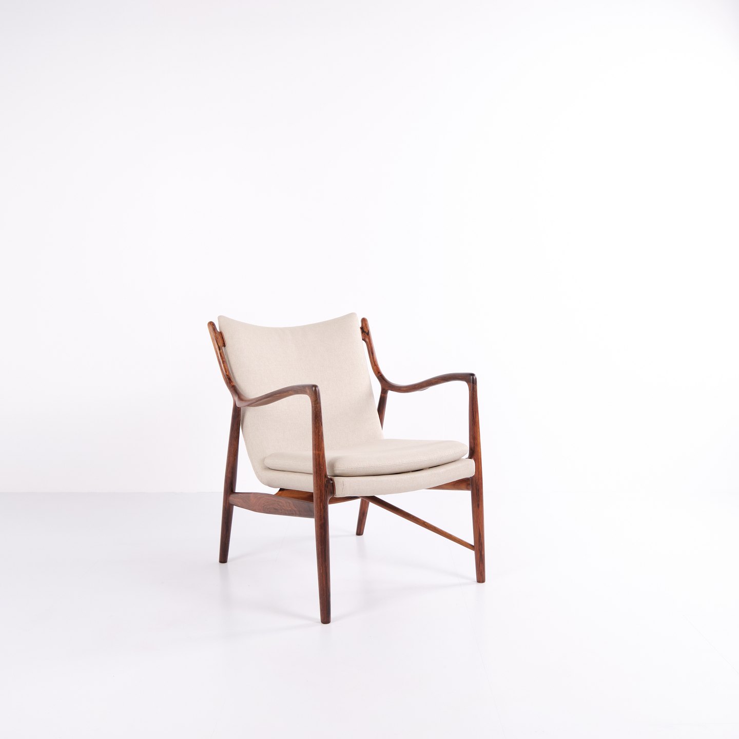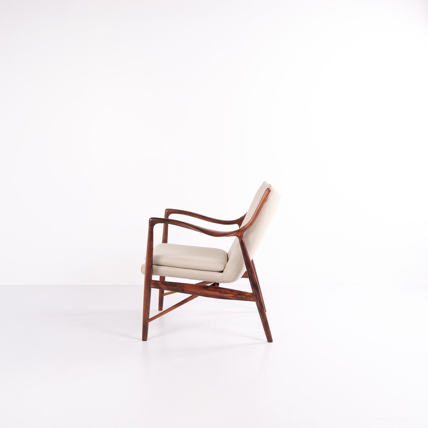 Ikonisk lænestol, model NV45, designet af Finn Juhl og udført af snedkermester Niels Vodder i 1950’erne. Stolen er fremstillet i palisander med fritbærende sæde og ryg betrukket med lyst stof, hvilket fremhæver Finn Juhls karakteristiske skulpturelle formsprog og lette konstruktion.