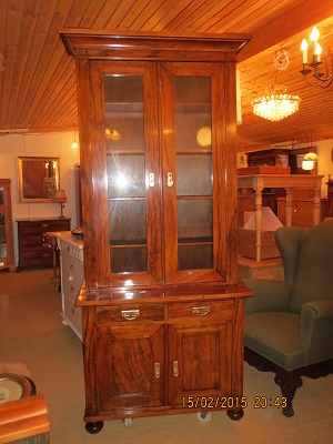 Bogskab mahogni restaureret håndpoleret med 2 glaslåger 2 fyldningslåger Flytbare hylder 2 skuffer mål H 212, B 94, D underskab 45, D overskab 33 cm. 1100/04-P