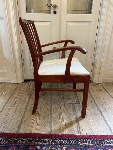 Dansk snedker armstol i bejdset bøgetræ sæde betrukket med hvidt stof. Udført ca. 1930'erne. Brugt stand fremstår med ridser og mæker, samt betræk med pletter.