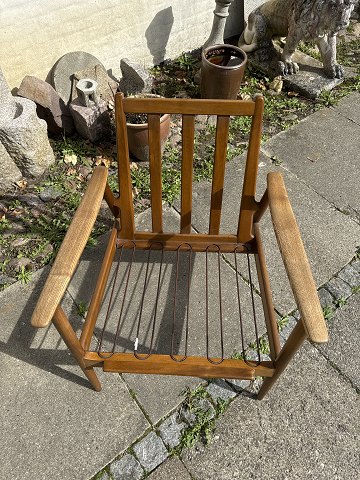 Fremstår i brugt stand, stel med ridser og mærker samt hynder med mindre huller og løs stofkeder. Bør ombetrækkes.