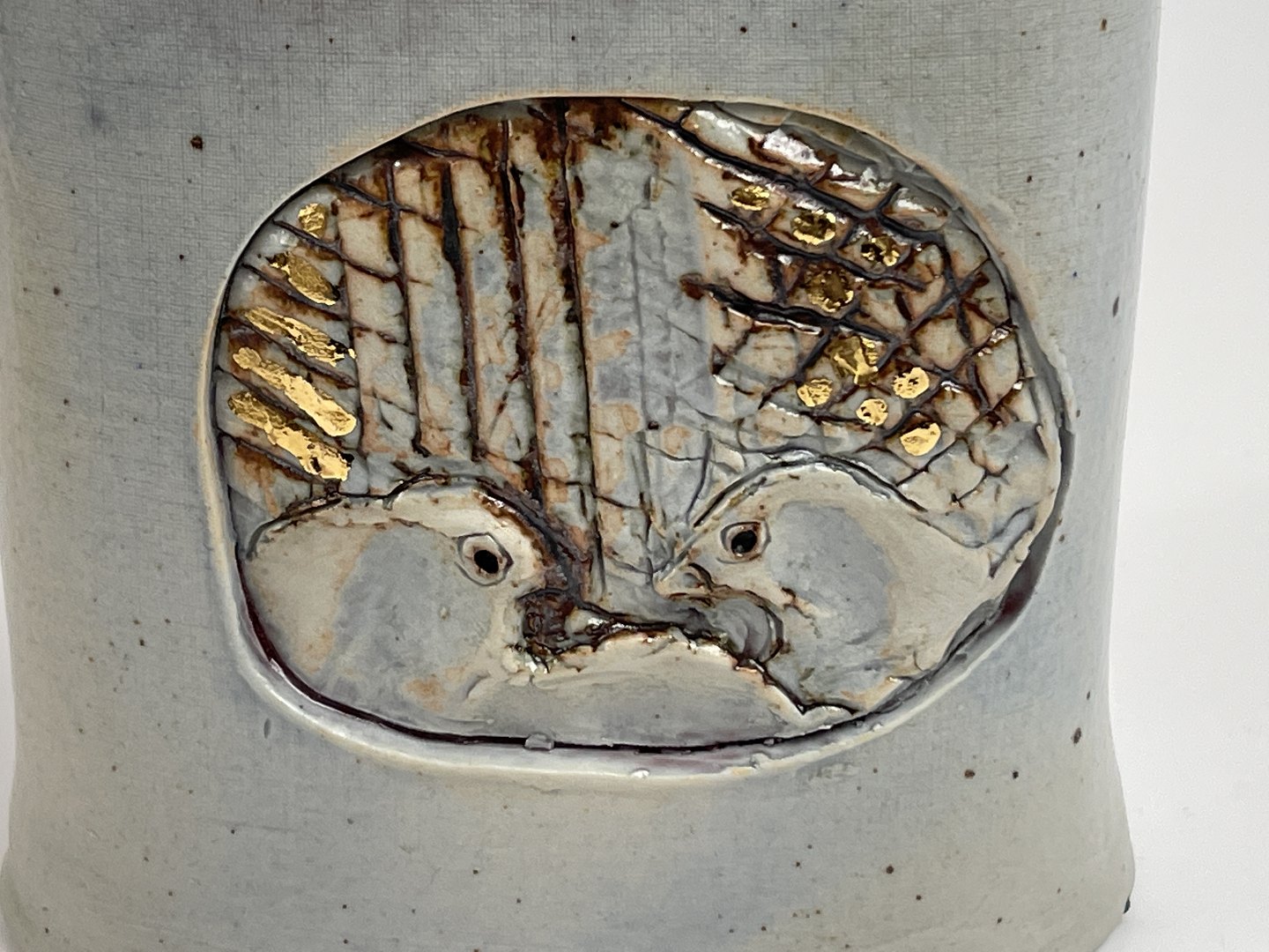 Beautiful ceramic vase with a motif of birds in a nest. Signed with monogram GØ for Gerda Østergaard. Own workshop. Label: Dansk Kunsthåndværk (Danish handicraft). The colors alternate between grey, beige, pink and gold.