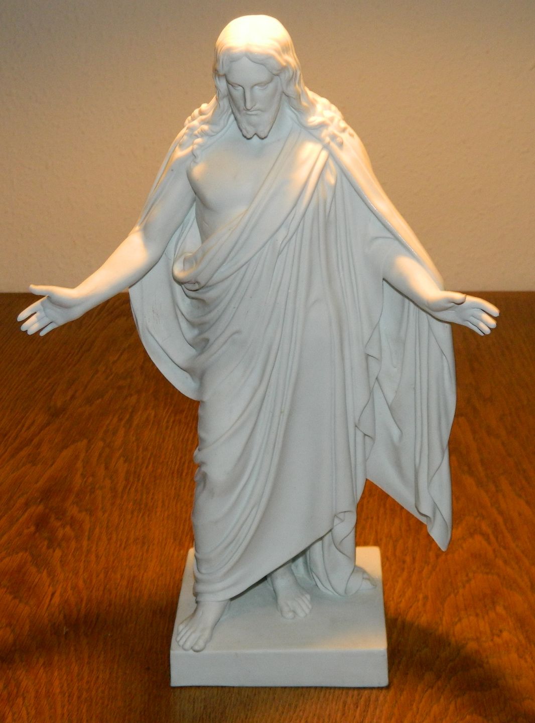 Figur af Kristus i bisquit fra Bing & Grøndahl. Modelleret af Bertel Thorvaldsen i Rom 1821. Denne reproduktion fra Bing & Grøndahl er fremstillet i slutningen af 19. århundrede. Fremstår i god stand uden skader. På bagsiden af soklen indstemplet B&G ENERET. Figuren er 37 cm høj. KAN IKKE SENDES !