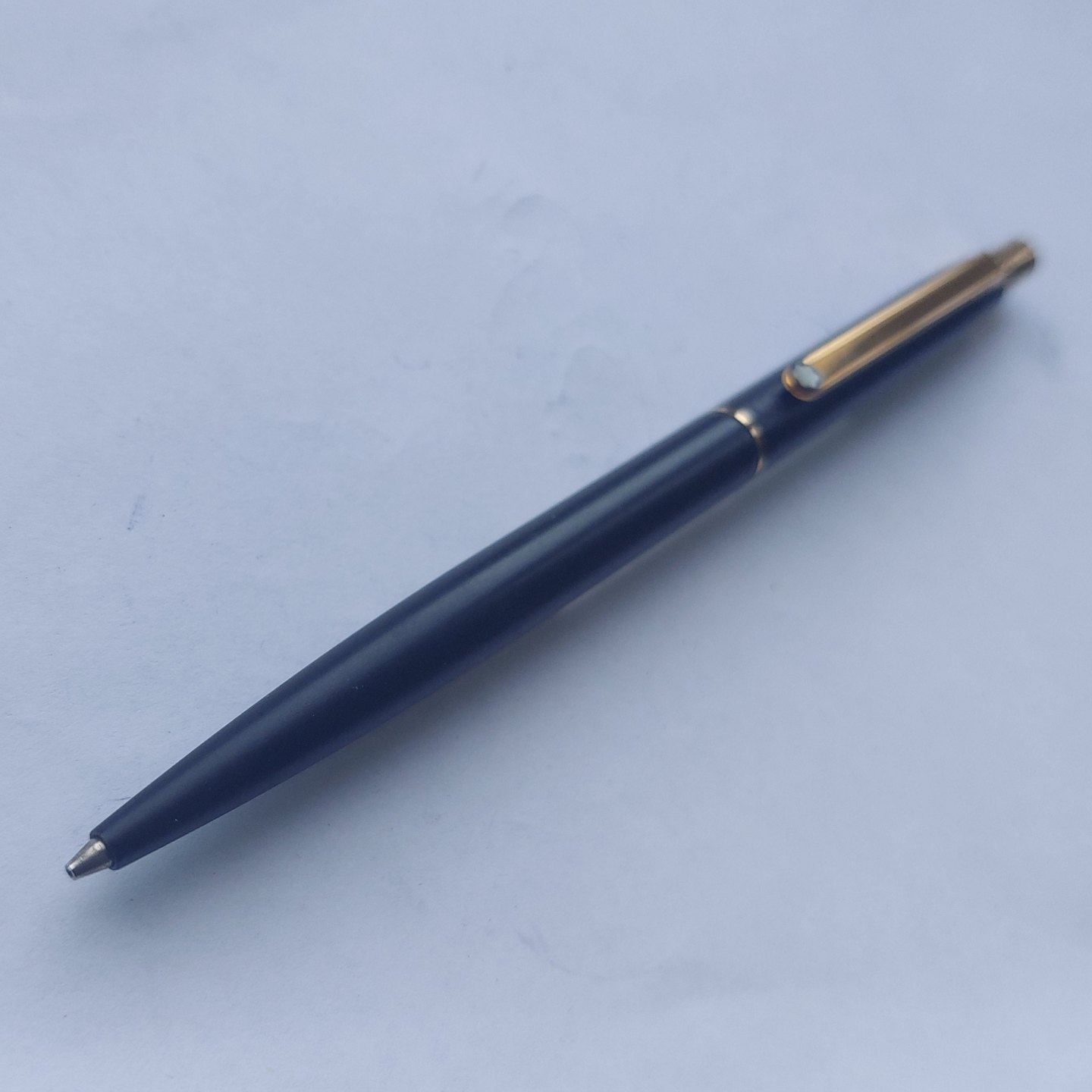 Slank Montblanc Slim Line kuglepen. Mat grålig metallisk overflade. Stjerne på toppen samt.på clip'en. I god stand uden skader eller reparationer. Ej heller buler eller andre brugsspor. Refill'en der sidder i fungerer. Ingen garantier for hvor længe den virker. Ny refill kan stadigvæk tilkøbes.