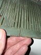 Håndlavet i træ: Grønt bemalet vævespjæld fra 1834 med dekorationer. Mindre revne nederst på vævespjældet. Krampe bortkommet. 30 cm B. 19 cm