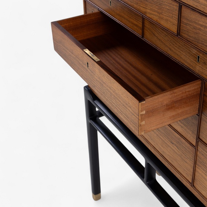 Rare cabinet in rosewood with drawers and black lacquered frame with brass shoes.