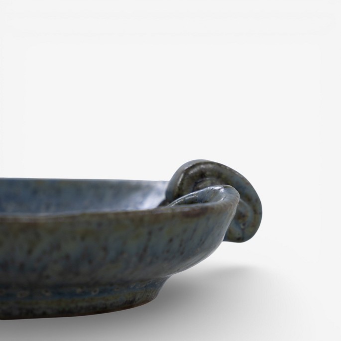 Lille fad i stentøj m. blågrøn glasur. Signeret.