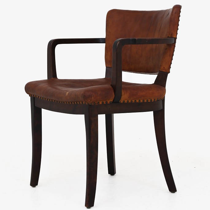 Armchair in stained beech with original patinated aniline leather and brass nails. Stamped by manufacturer.