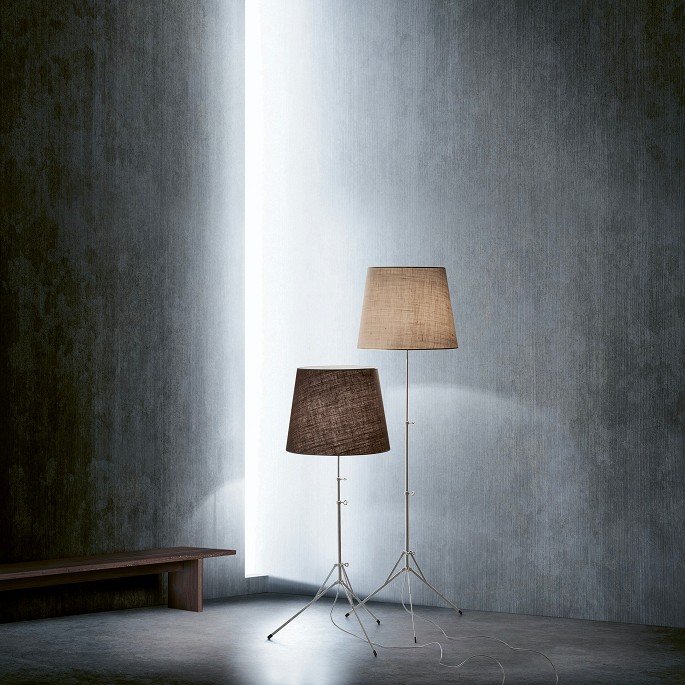 Gilda gulvlampen blev designet i 1997 af italienske Enrico Franzolini. Lampen skiller sig ud med sin store skærm i hør på det justerbare tripode stel inspireret af fotografers kamera stel.