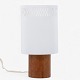 Cylindrisk formet bordlampe med base i patineret teak og skærm i hvidlakeret metal.