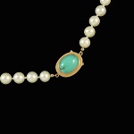 Pearl Necklace with 14k Gold and cabochon Jade lock.