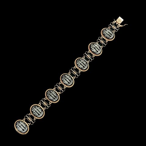 Armbånd i 18k guld med kamé-udskæringer. Stemplet 18k Italy. L. 17,3 cm. Width 1,8 cm. Vægt 16,8 g. Brugt i god stand.