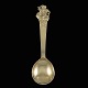 Rund barne/dessert-ske i forgyldt sølv med motiv fra H.C. Andersens eventyr.