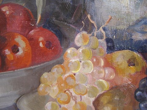 Opstilling med Pæoner og frugt sign. I. B Debois 99*68 cm. med ramme 110*79 cm. Emne nummer: 11483
