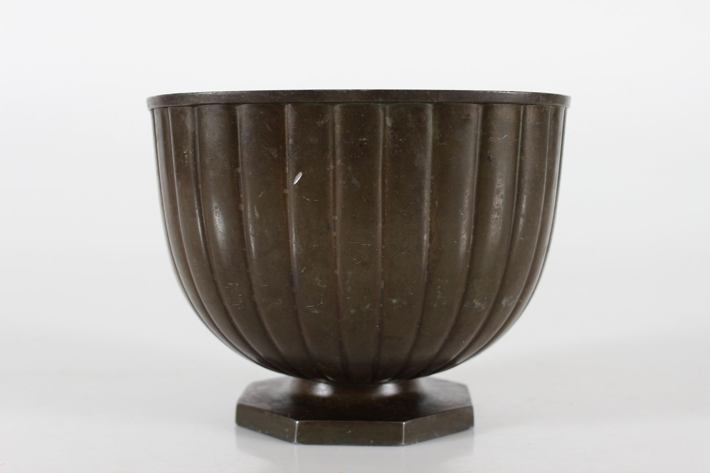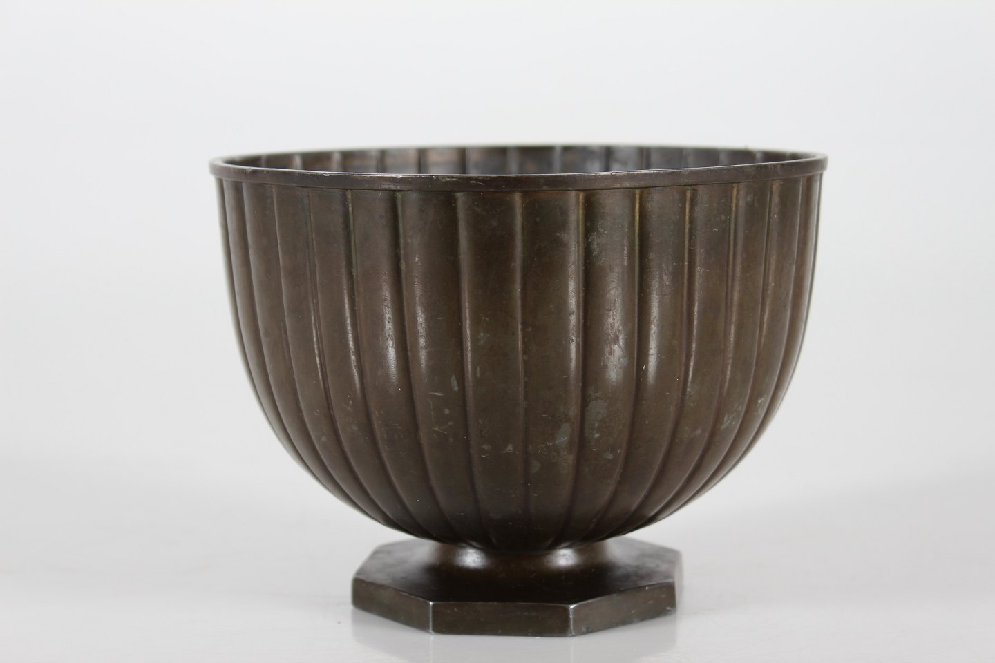 Just Andersen (1884-1943) Firkantet skål på lav fod af brunpatineret discometal, model nummer 1831 Sign. Just A + 1831 Højde 11 cm Længde x bredde: 14,5 x 14,5 cm Pæn stand med god patina - se billeder af små ridser