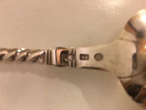 sølv ske med snoet skaft og ansigt.
