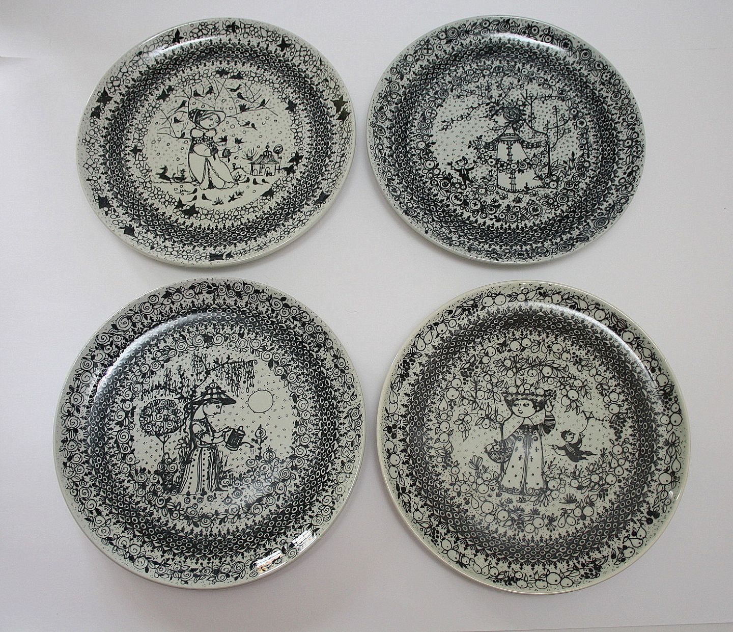 Nymølle, Bjørn Wiinblad. Årstiderne 4 forskellige motiver. Sort/hvid. Diameter 21,5 cm. Pris: 150 kr. stk.
